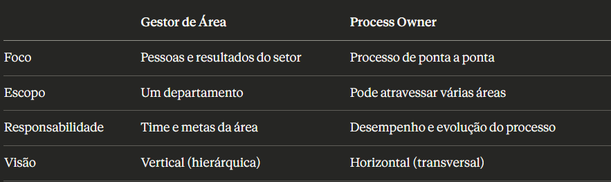 💡 Resumindo em uma frase: O Dono do Processo é quem responde pela saúde, pelo desempenho e pela evolução de um processo específico dentro da empresa.
